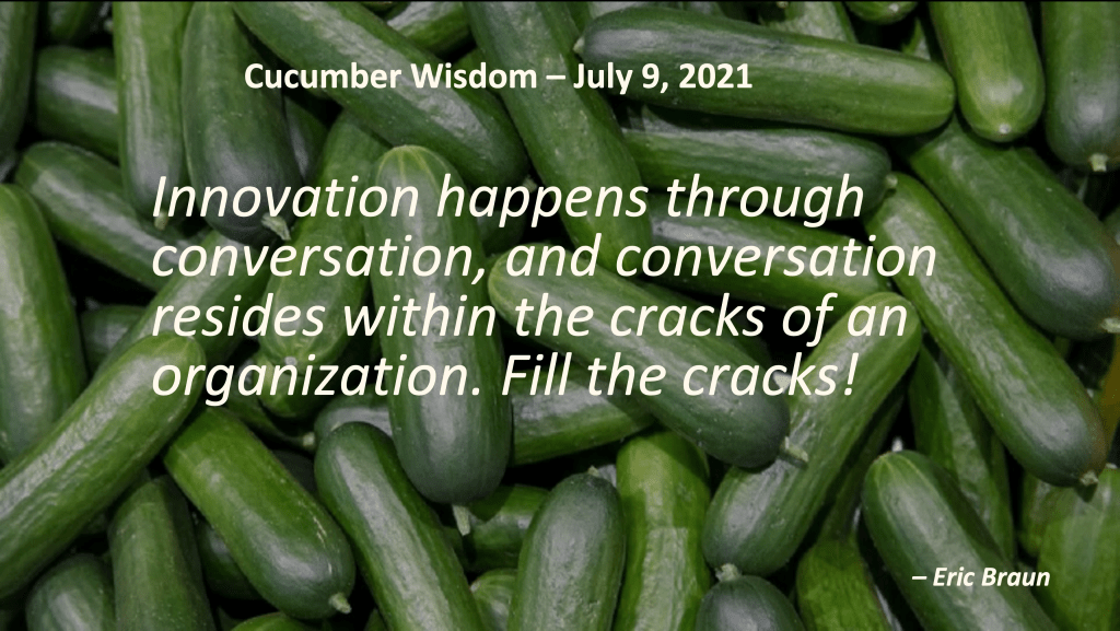 July 9, 2021July 25, 2021 ericbraunx Innovation happens through conversation Innovation happens through conversation, and conversation resides within the cracks of an organization. Fill the cracks! Share this:TweetLike Loading... Related